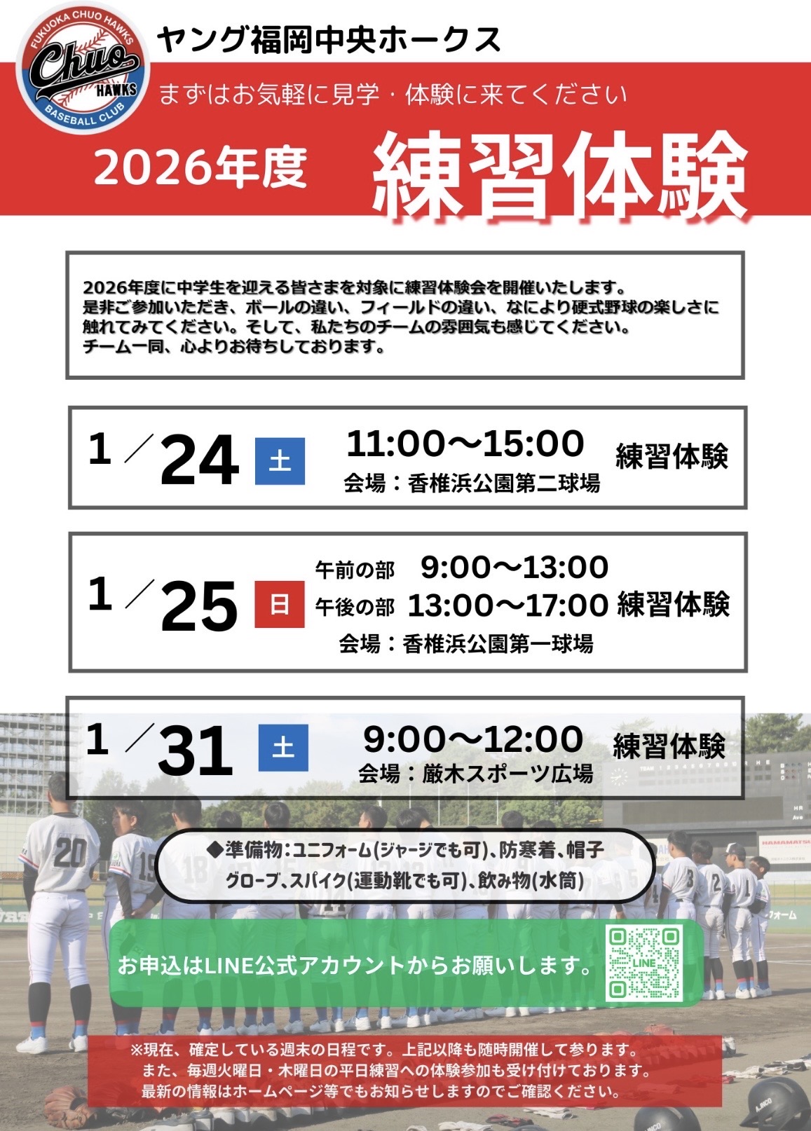 福岡中央ホークスでは、特別に単独の体験会を設けるのではなく、普段の練習への参加型の体験をご案内しております。