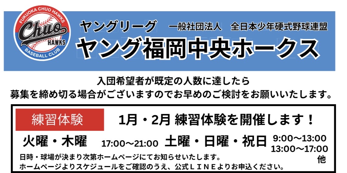 ヤング福岡中央ホークスに新しい仲間が増えました!!これからお互い切磋琢磨し、一緒に全国大会優勝を目指そう!!
